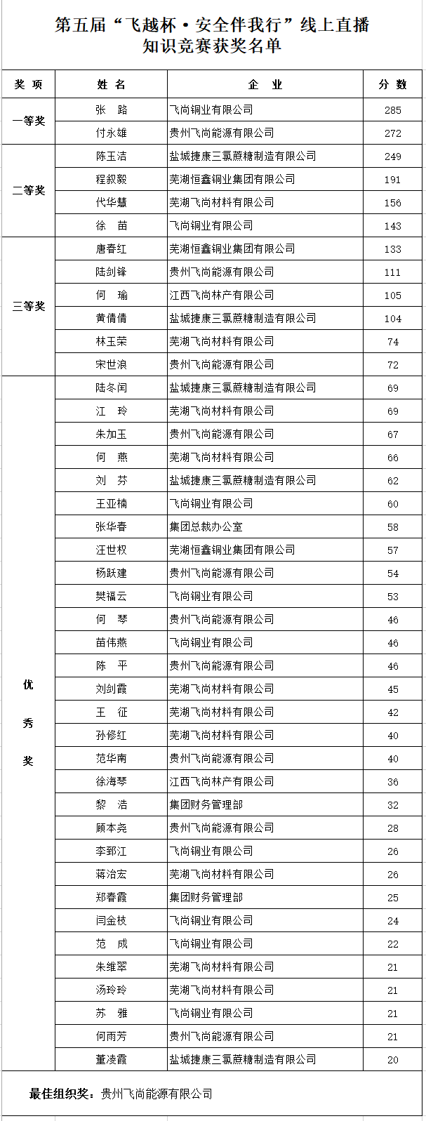 12月28日晚,飛尚集團(tuán)第五屆“飛越杯·安全伴我行”線上直播知識(shí)競賽正式結(jié)束。根據(jù)競賽規(guī)則,統(tǒng)計(jì)所有參賽者的最終得分,共59名參賽者取得競賽分?jǐn)?shù),其中飛尚銅業(yè)有限公司張路、貴州飛尚能源有限公司付永雄分別以285分、272分的成績獲得一等獎(jiǎng)。貴州飛尚能源有限公司因得分總數(shù)第一、參賽人數(shù)第一,獲得最佳組織獎(jiǎng)。
