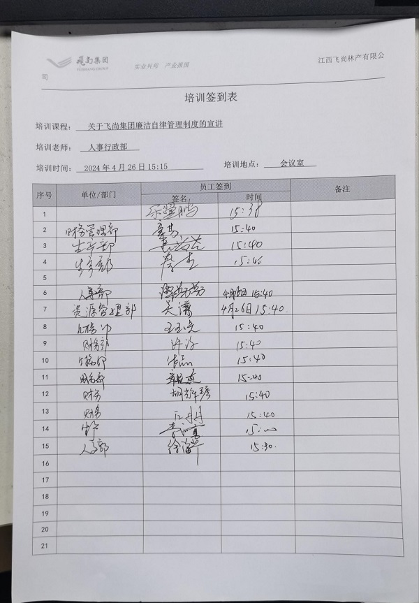 《飛尚集團廉潔自律管理制度》發布后,各成員企業相繼出臺本企業廉潔自律管理制度和各項管理規定,并通過微信工作群廣泛宣傳,不斷健全員工參與機制,充分發揮員工的積極性、創造性,夯實廉潔文化建設的群眾基礎。江西飛尚林產有限公司通過座談會進行深入宣貫,鹽城捷康三氯蔗糖制造有限公司打造了廉潔文化長廊,拓寬了宣貫渠道和方式。